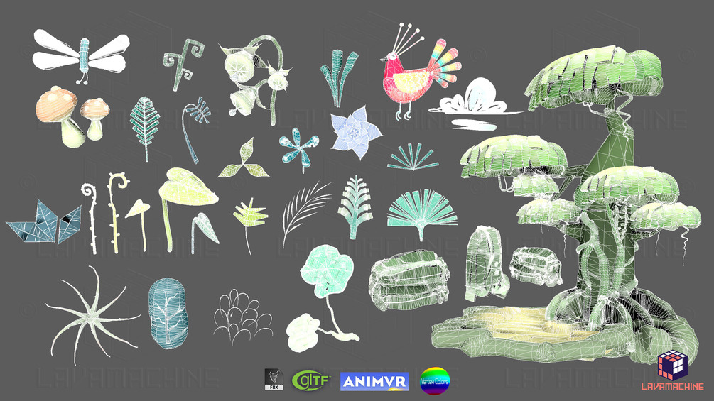 All objects sorted as *fbx, *gltf, *stage (AnimVR file) with vertex colors on it. (no UV maps)